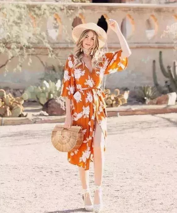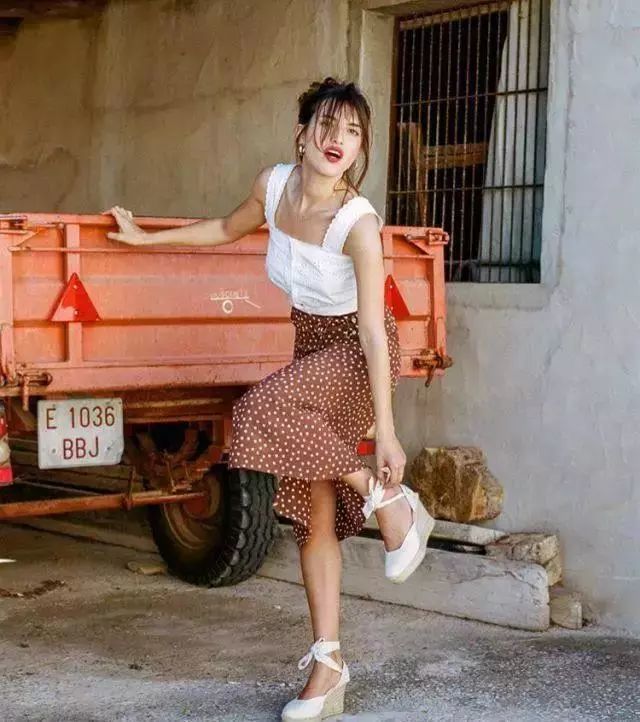 茶歇裙也是深V设计,修饰脸型,并且自带腰线,凸显腿长,碎花的点缀充满了悠闲浪漫的味道,女人味十足。