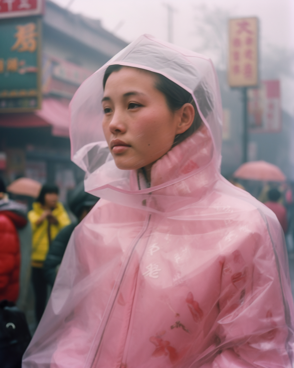 一个多月前,我用Midjourney做了一张图,是一个穿粉色雨衣的人。灵感来源于我喜欢的一个摄影师。