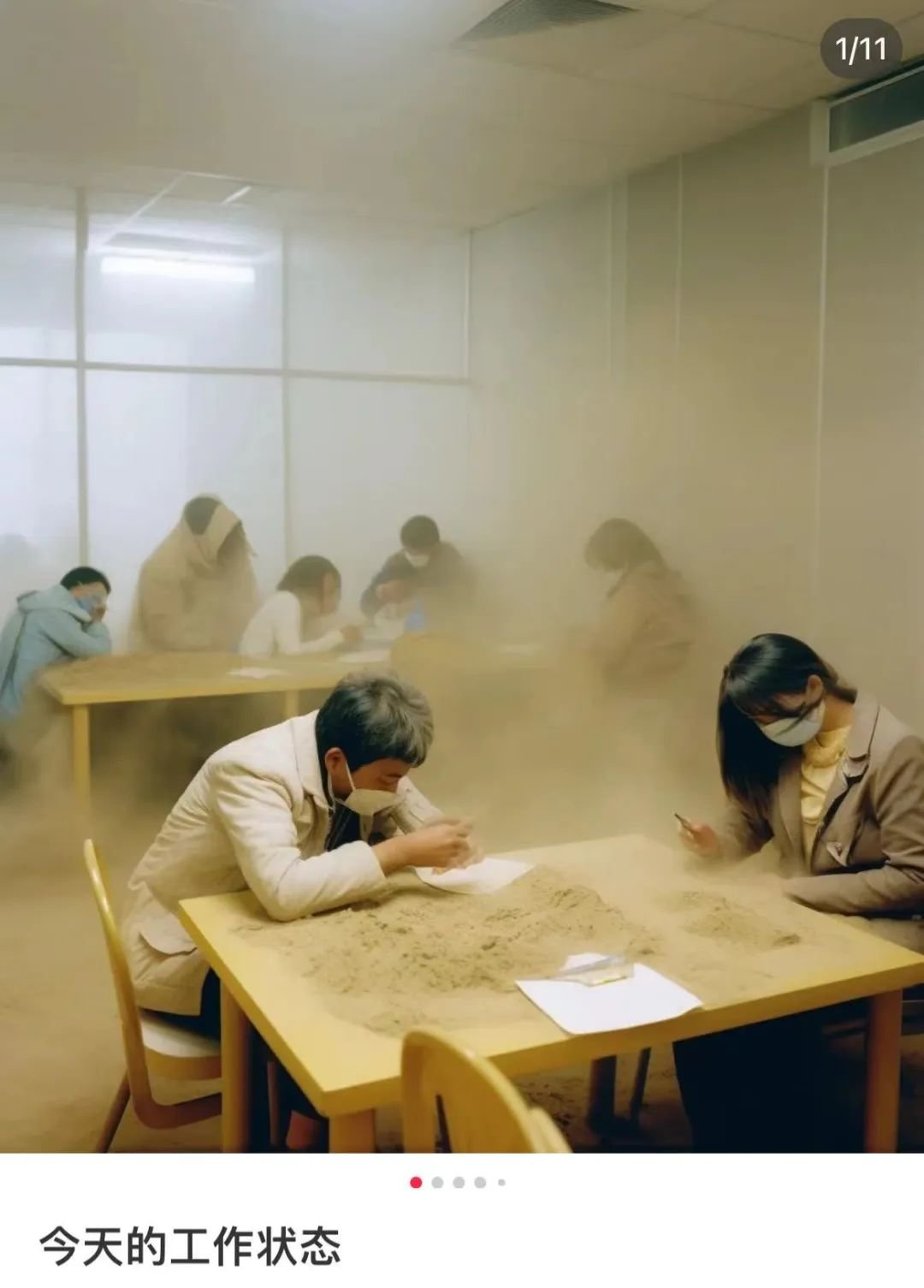 之前北京扬沙,我利用AI做了沙尘和办公室结合的一组创意作品。我想生成一整套创意作品的作品集。我比较喜欢用AI表现创意的这个方向,形式不拘泥于真实照片,这种创造性的东西才是作为人类或者设计师去追求的东西。