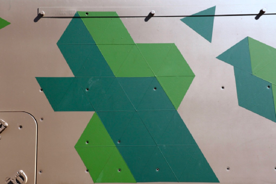 ▲新型战术伪装(CAM.TAC)方案是将等边三角形图案有机拼接组装在一起,形成分段的几何组合,以打破装甲车辆轮廓形状