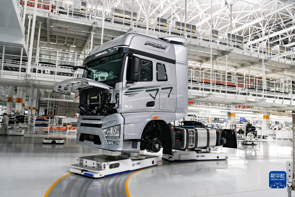 在位于吉林长春的一汽解放汽车有限公司,一台AGV行驶在J7智能工厂车间内(6月12日摄)。