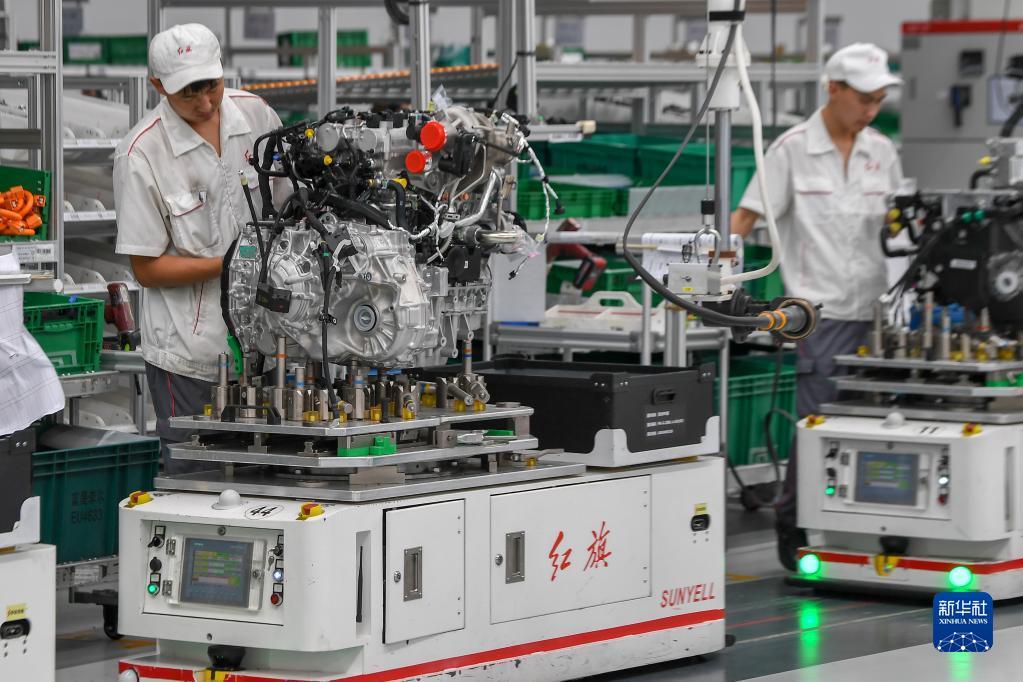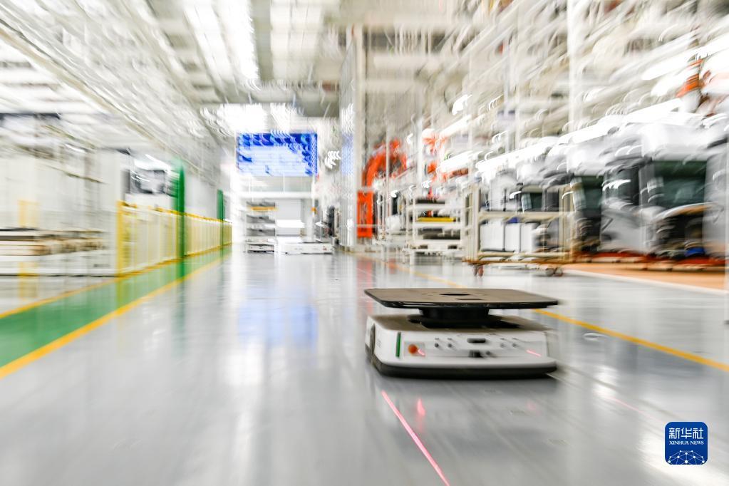 在位于吉林长春的一汽红旗繁荣工厂总装车间内,AGV搬运机器人将车辆零部件运输到工位上(7月6日摄)。