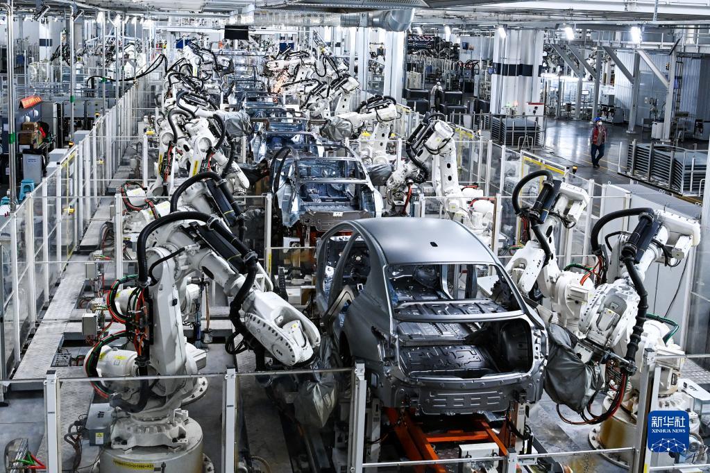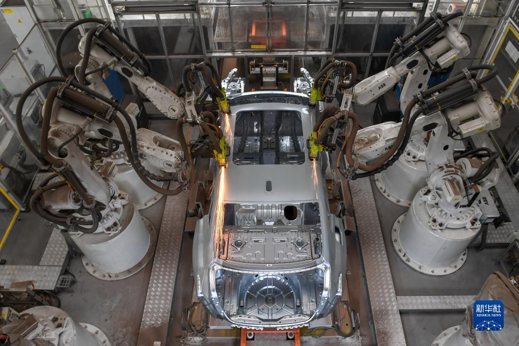 在位于吉林省长春市的一汽红旗繁荣工厂焊装车间内,焊装机器人在生产线上焊接车身(2022年10月17日摄)。