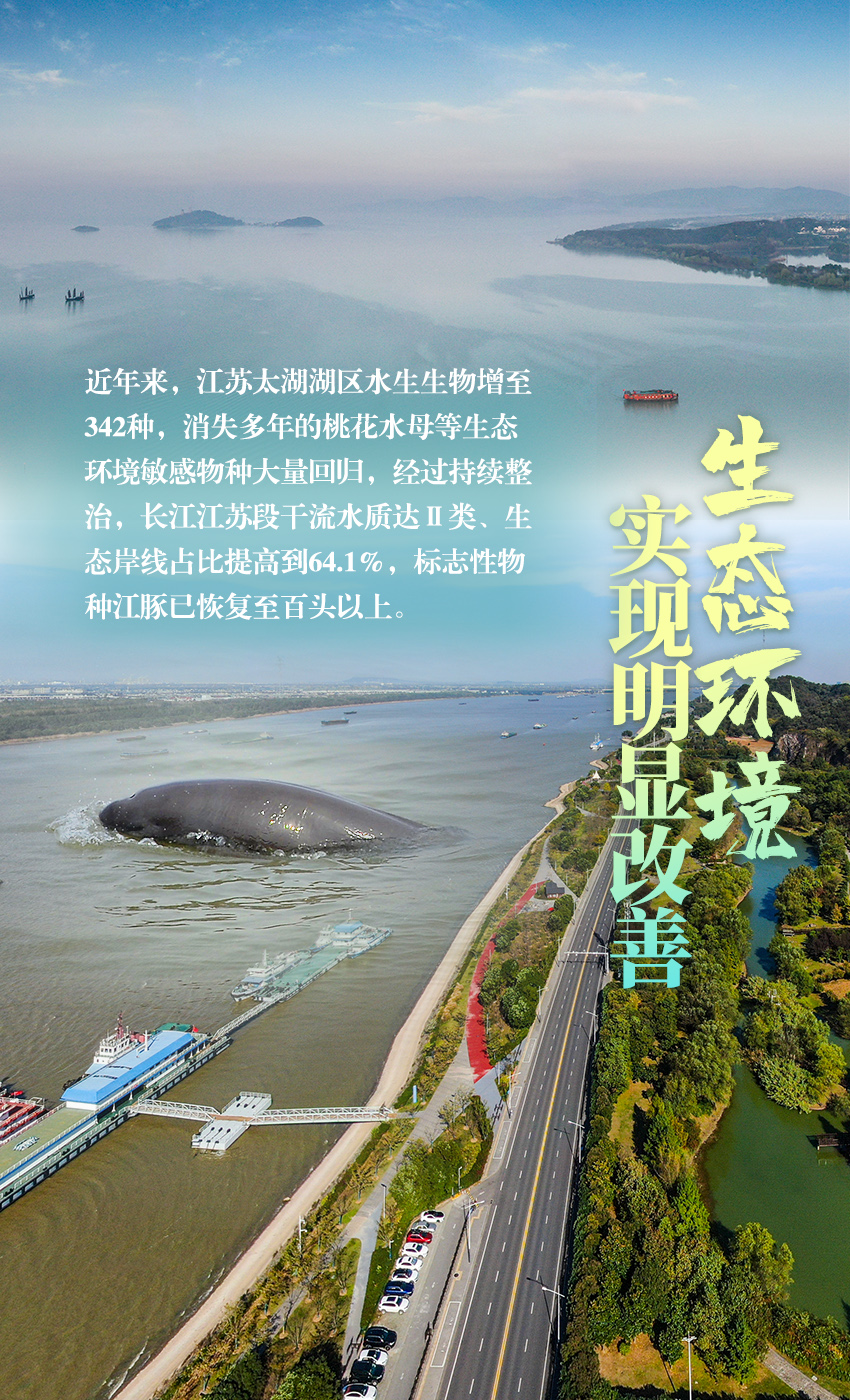 2007年以来,常住人口增加675万、GDP增加3倍,江苏太湖流域水生态实现明显改善:湖区水生生物增至342种,“太湖三白”之一的白鱼种群数量恢复到优势水平,消失多年的桃花水母、白鹭、地衣等生态环境敏感物种大量回归。