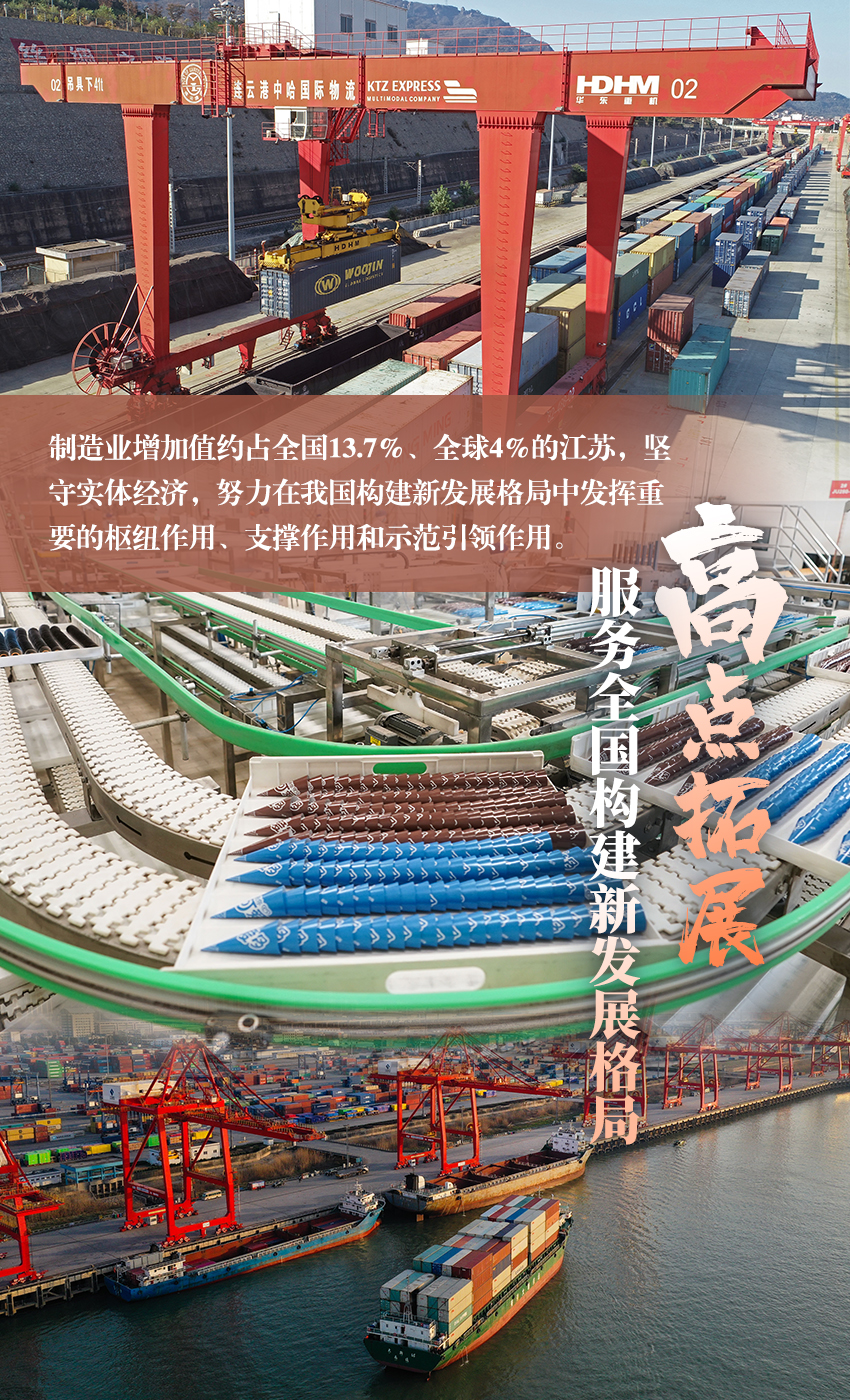 加快构建新发展格局,是推动高质量发展的战略基点。面对世界产业体系加速演变,制造业增加值约占全国13.7%、全球4%的江苏,坚守实体经济,努力在我国构建新发展格局中发挥重要的枢纽作用、支撑作用和示范引领作用。