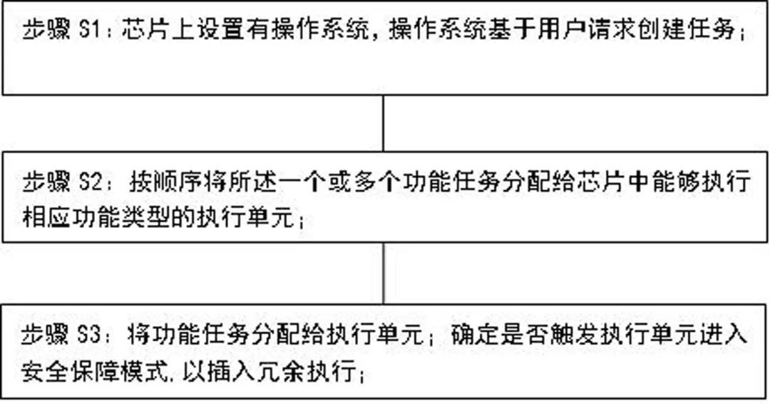 专利摘要显示,本发明涉及一种芯片功能安全故障处理方法,所述系统包括:步骤S1:芯片上设置有操作系统,操作系统基于用户请求创建任务;步骤S2:按顺序将一个或多个功能任务分配给芯片中能够执行相应功能类型的执行单元;步骤S3:将功能任务分配给执行单元;确定是否触发执行单元进入安全保障模式,以插入冗余执行。