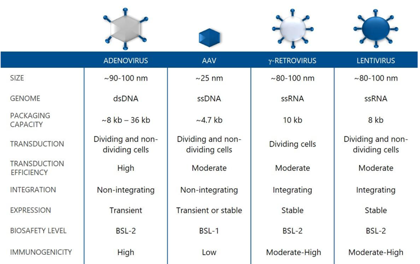 腺病毒在许多不同的细胞类型中表现出广泛的亲和力,这是腺病毒成为基因治疗的先驱并随后发展为疫苗载体的原因之一。腺病毒基因组有五个早期区域:E1A、E1B、E2、E3和E4。E1A蛋白可激活其他病毒基因,对病毒复制起着非常重要的作用。只要使得该区域的基因缺失或是用目标基因替换,就能得到适于人使用的安全的病毒载体。因此,人类和动物的大多数研究均使用了E1基因缺失的病毒作为载体。而E2、E3、E4编码序列的缺失则会增加目的基因片段插入的能力。进入细胞核后,腺病毒会在局部保留,而不是整合到宿主基因组中,从而将插入性肿瘤发生的风险降至最低。腺病毒载体可以通过各种系统途径和粘膜途径进行给药,并且能够同时转导静止和活跃分裂的细胞。