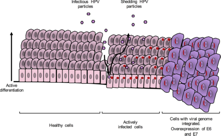 持续性的感染会可能导致病毒基因组整合到宿主细胞中,诱发侵袭性宫颈癌。在典型的hrHPV致癌过程中,HPV基因组被整合到宿主的染色体DNA中,E2序列在基因组线性化过程中被打乱。而E2蛋白是E6和E7的转录抑制因子,因此一旦E2被破坏,E6和E7就能够在宿主体内顺利转录。E6蛋白随后促进宿主凋亡调节蛋白p53的降解,激活端粒酶,从而延长细胞寿命;E7蛋白以肿瘤抑制因子视网膜母细胞瘤蛋白(pRb)为降解目标,导致细胞生命周期向S期过渡,从而造成宿主细胞基因组复制。E6和E7两类调控蛋白通过破坏细胞周期,延长宿主细胞寿命,造成基因组不稳定,最终导致癌症的发生。