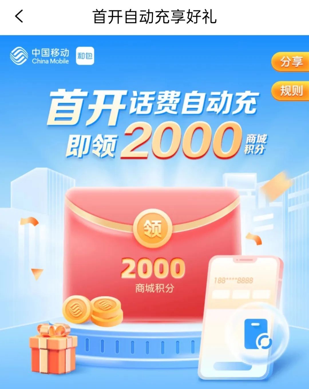 首次开通话费自动充功能,可以得到 2000 商城积分。