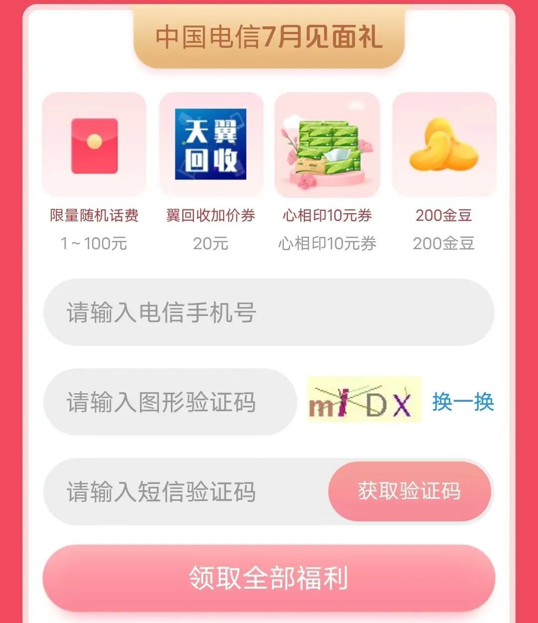 点击它,会启动中国电信 APP,输入手机号,就能领取见面礼了。