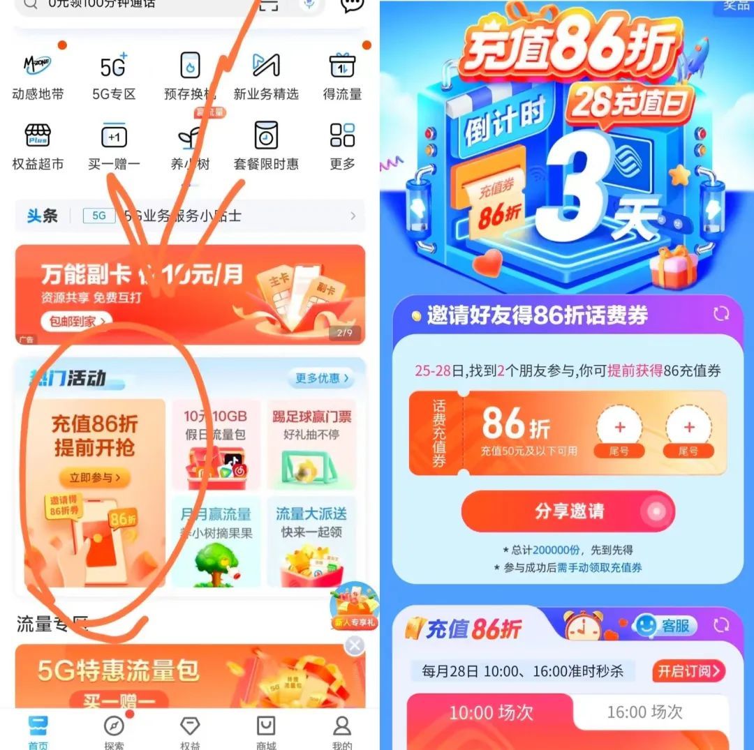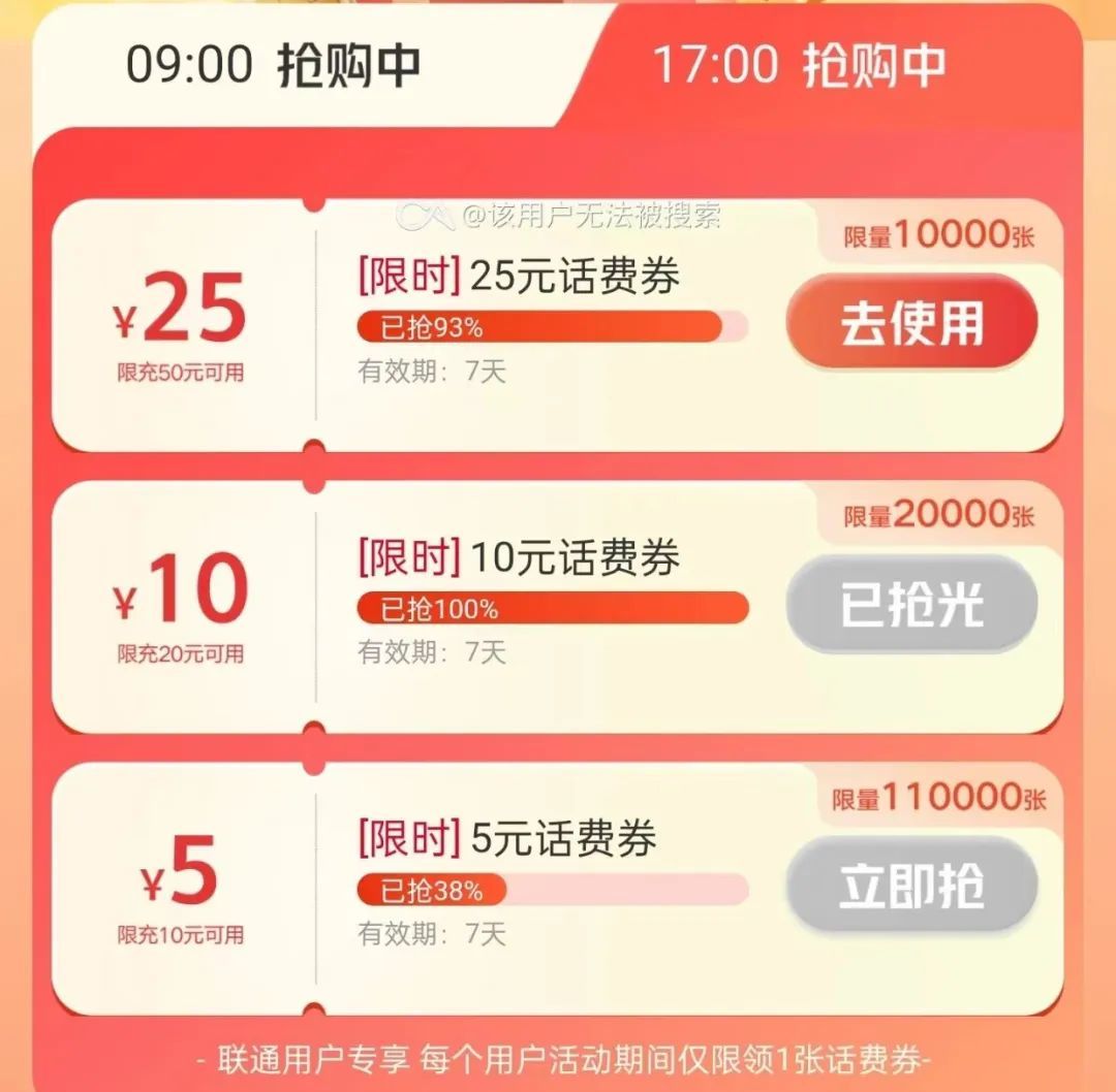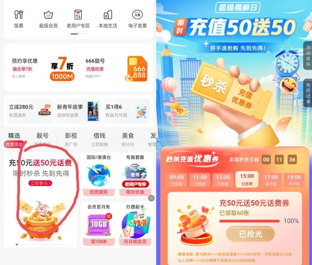 它和移动一样,在每个月 28 号都有充值优惠活动,而且力度比移动要大。