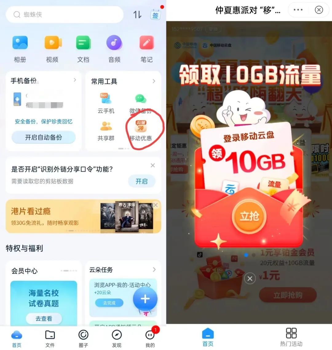 例如,中国移动云盘首页有个“移动优惠”,点进去,会弹出一个领取流量的链接。