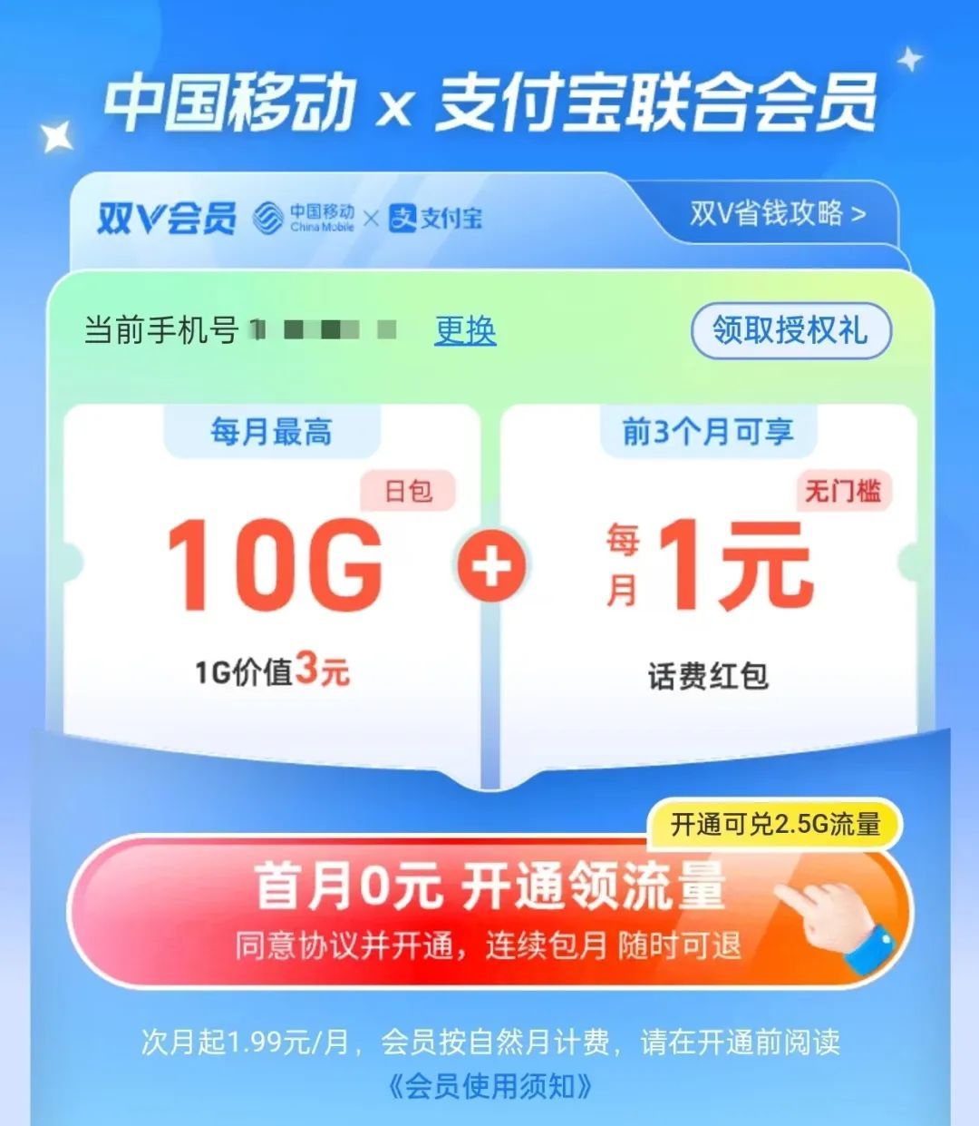 搜索“双 V 会员”,开通之后能获得流量日包和话费红包,费用不高,而且随时可以退订。