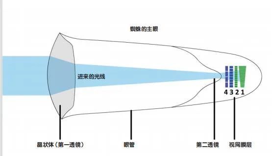 虽然跳蛛的晶状体是实心的,但造化赐予跳蛛一个变通的方法:它的晶状体不是像我们那样的椭球形,而是一根实心的管子,或者叫眼管。