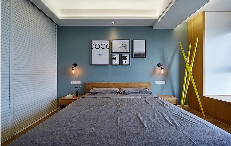 ▲床头墙上挂一组黑白调的装饰画,两侧实木床头柜上方加入壁灯,靠窗位置摆一个黄色的极简衣帽架,床铺上布置灰色床单,侧边是推拉门的衣柜,为主人打造了一个简约实用的卧室环境。