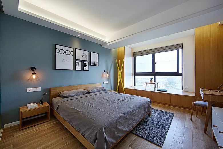 ▲主卧室天花无主灯的灯带设计,以丹蓝色的床头墙为主,飘窗以抽屉的设计,摆上一张休闲小茶几,两侧也装上收纳柜,把飘窗打造成一个休闲惬意又实用收纳的设计。摆上实木床、床头柜,床尾布置一个实木梳妆台,显得简约实用。