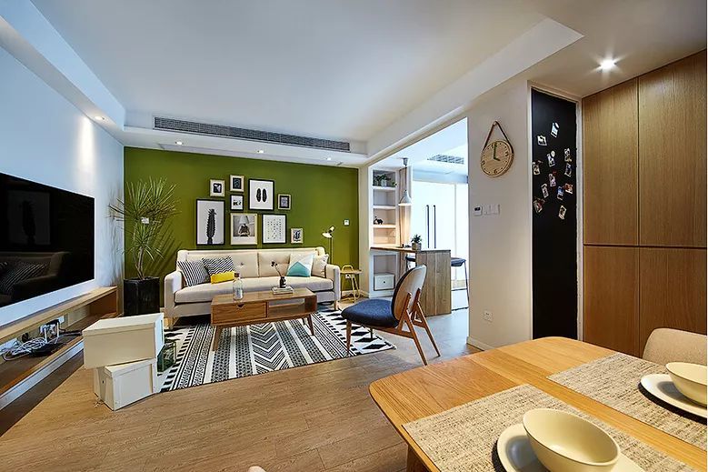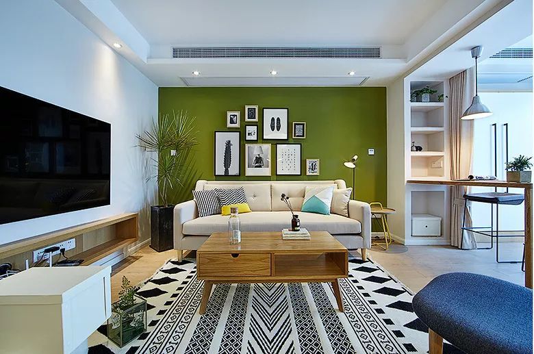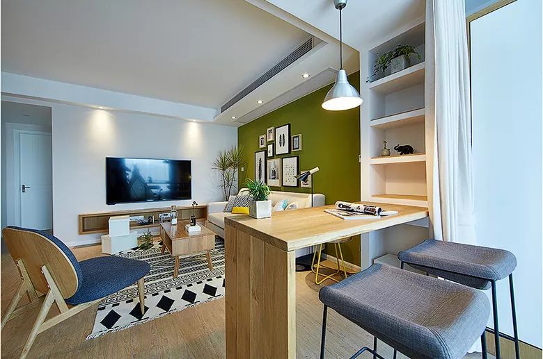 ▲沙发墙则是草绿色的,挂一组装饰画,角落加入绿植装饰,让空间清新文艺;沙发墙右侧加入边几与落地灯,并在靠窗位置装了展示架与休闲吧台,为主人营造了一个惬意轻松的休闲工作环境。