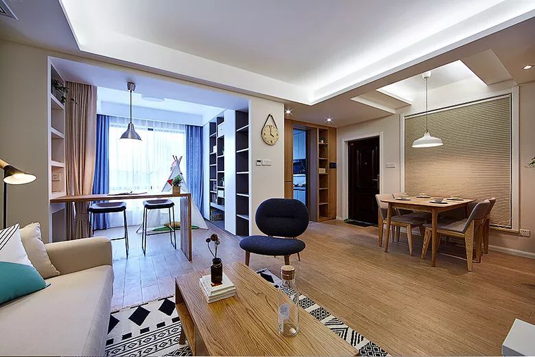 ▲客厅靠窗位置设置一个吧台,搭配两张吧椅,吧台侧边是开放展示架,吧台上方装一盏吊灯,坐在这里可以纵观整个客厅,为主人提供了一个简约舒适的空间体验。