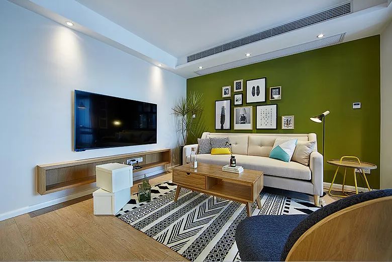 ▲客厅四周吊顶+筒灯的天花设计,电视墙与沙发墙并不是对向布置。电视墙简洁大方的基础,壁挂电视机+悬空电视柜的设计;木地板的地面上,布置米白色布艺沙发,搭配黑白几何图案的地毯,摆上实木茶几,让空间显得简约自然而大方舒适。