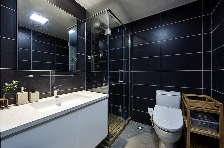 ▲卫生间以灰色地砖+黑色墙砖,洗手盆+淋浴房齐平布置,马桶布置在淋浴房外,整个卫浴空间时尚端庄而实用大方。