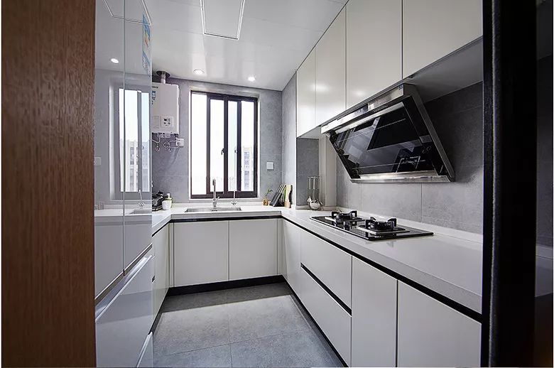 ▲厨房以浅灰色的地砖墙砖,加上现代简洁的白色橱柜,厨房操作台是U字形的布局,进门左侧摆一个大冰箱,为主人提供了实用方便的烹饪空间。