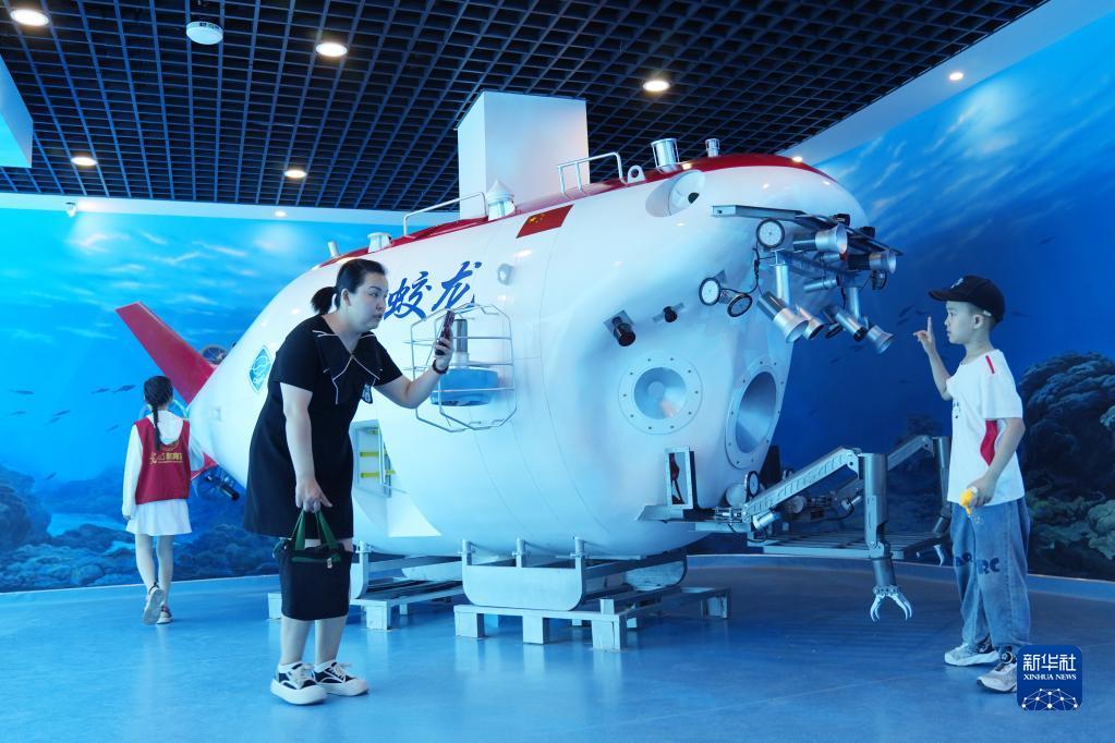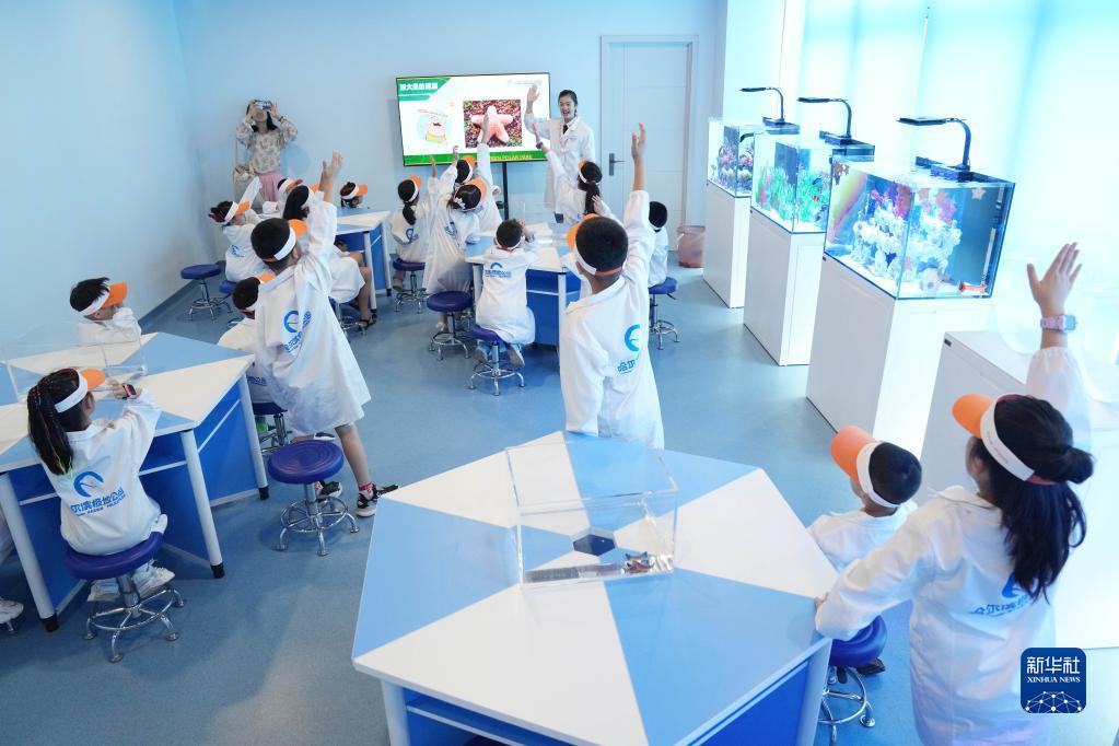 7月8日,在“淘学企鹅馆”的海洋实验室,工作人员在给孩子们介绍海洋知识。
