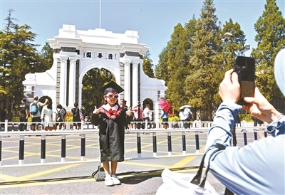 图为游客在清华大学校园标志性建筑前打卡拍照。