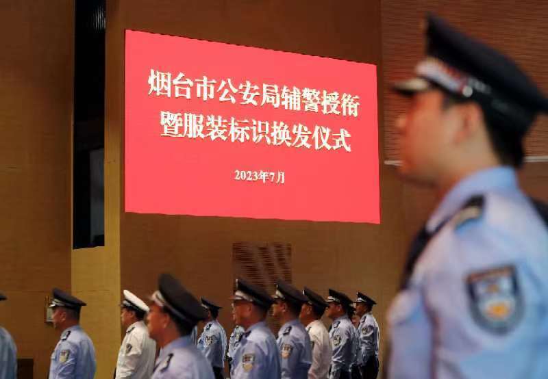 7月5日,烟台市公安局举行隆重仪式,为辅警授予新的辅警衔并换发新的服装标识。这是推进辅警管理改革的一项重大举措,标志着全市公安机关在辅警规范化、制度化、法制化管理迈上新台阶。