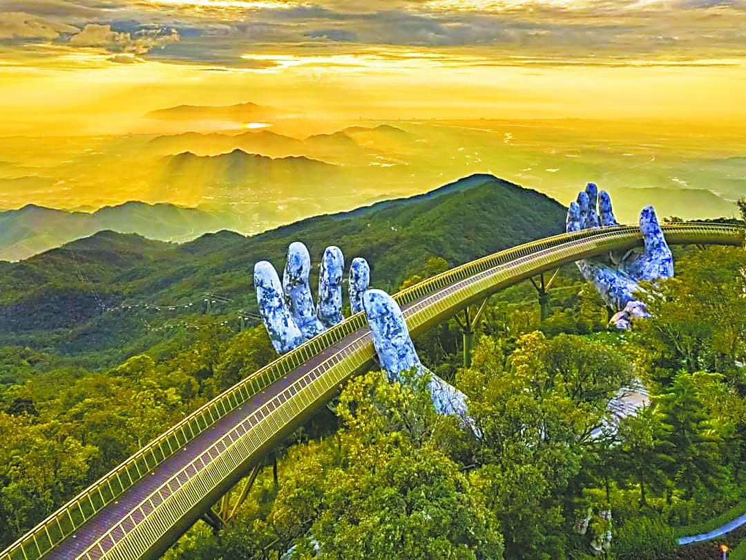 让人在佛手间行走的金桥是岘港的新地标,持续吸引一批又一批游客前来参观。西方游客视这双手为“上帝之手”,认为在桥上行走会获得上帝的庇护。桥面行走的感觉如同漫步云端,很多人相信穿越这座桥会带来好运,于是每逢节假日桥上总是挤满游客。在越南景点中,除了庙会人最多的要数金桥了。这座桥还是艺术家们的“缪斯”。金桥曾化身为万众瞩目的模特走秀平台和公益音乐节表演舞台。桥梁造型融入自然山水,“云彩”婚礼时装秀、“天空漫步”时装秀,都曾将金桥的云端佛手之美作为背景板。