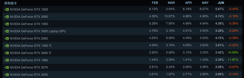 首先是大家最关心的部分,那张神一般的显卡GTX 1650还是霸占了榜首的位置,不过占有率相比上个月下降了0.4%,回到了5.67%,这也是近3个月首次掉到6%以下。第二名也易主了,以前我们经常见到的是2016年发布的那张甜品卡——GTX 1060,但现在换成了RTX 3060,在上个月的排行榜中位居第三,尽管在6月的占据份额下跌了0.13%来到4.60%,但还是超越了GTX 1060。1060目前位居第三,比例为4.58%,剩下的排名基本与前几个月没有较大区别。不过前10都被NVIDIA霸占,可见老黄的统治力还是相当离谱。