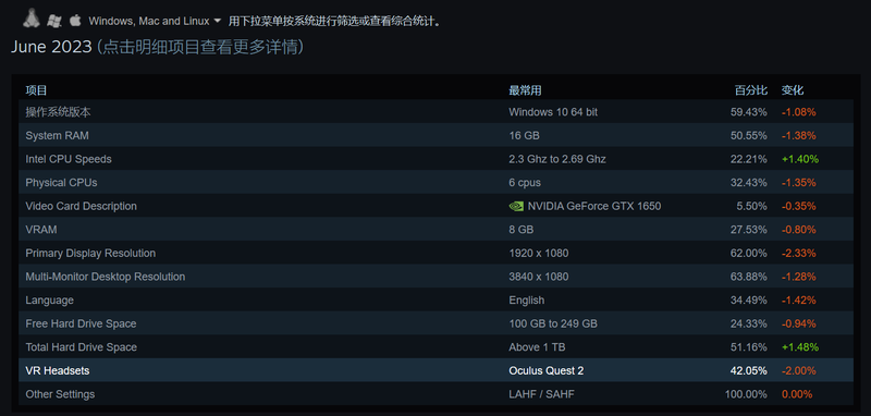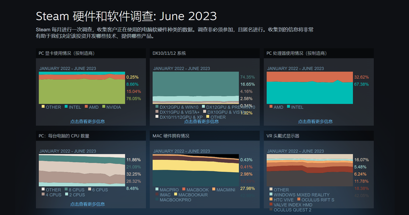 不过玩3A大作还要看你的硬件,这不,Valve发布了2023年6月份的Steam硬件调查结果。一起来看看新的一个月里,玩家的手上到底还有哪些稀奇古怪的硬件在发光发热。