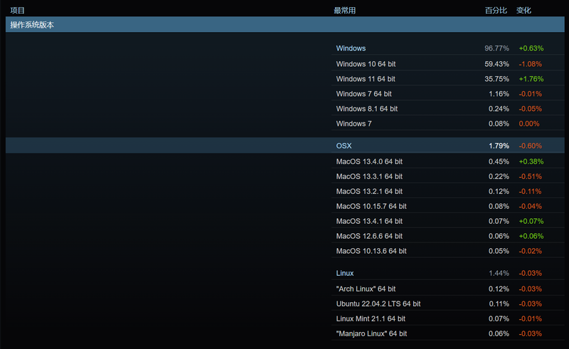 在其他数据方面,Win11已经推出一年之多,在去年6月份的时候,Windows 11的份额首次突破20%大关,现在Windows 11的份额继续上涨,这个月来到了35.75%,而Win10则开始走下坡路,下跌1.08%,,现在占有率已经不足60%了。至于MacOS方面,似乎没有因为苹果推出的Game Porting Toolkit让更多人在Mac上玩3A大作。