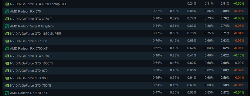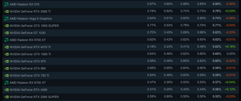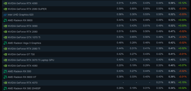 当然我们的老朋友RTX 40系显卡也不能忘,目前排名最高的是那张能媲美RTX 3090 Ti的RTX 4070 Ti,占比从上个月的0.46%提升至0.62%,甚至超过了旗舰级的RTX 4090,后者的份额在这个月也上涨了0.12%,占比来到0.56%,不得不说买得起RTX 4090的人还真的多。