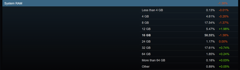 内存方面,16GB依旧是大部分玩家的首选,占比达到了50.55%,不过相比上月下降了1.38%。32GB的占比也逐渐上升,目前已经有17.61%,可见这段时间的固态跟内存降价确实让更多用户换上了更强的装备。