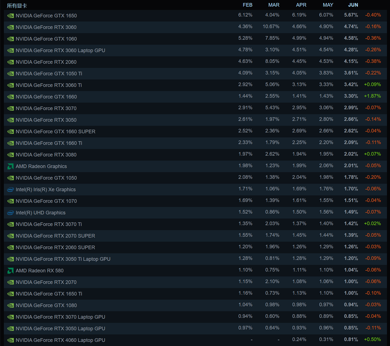 不要光看NVIDIA,我们也要雨露均沾一下,不过AMD与Intel排在前边的都是核显,要说这里面最好的排名可能是23名的RX 580,Intel嘛就更不好说了,它上线的锐炫Arc独显现在还没出现在Steam的硬件调查榜单里。
