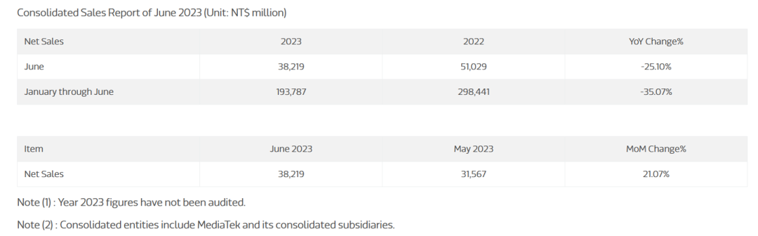 联发科于今日公布了 2023 年 6 月的销售额数据,2023 年 6 月合并净销售额总计 382.19 亿元新台币(当前约 88.29 亿元人民币),同比下降 25.10%,环比上升 21.07%。