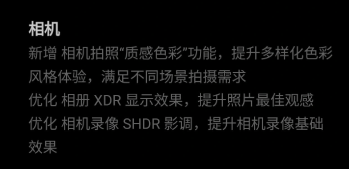 此次系统更新在相机和桌面新增了一些功能,针对网络、相册和多媒体进行了一些优化。(来源:IT之家)