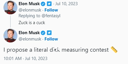 Twitter 老板埃隆・马斯克 (Elon Musk) 则在推特上对马克・扎克伯格(Mark Zuckerberg)猛烈抨击,称其是个“软蛋”,还要跟他举行一场“不可描述”测量比赛。(来源:IT之家)