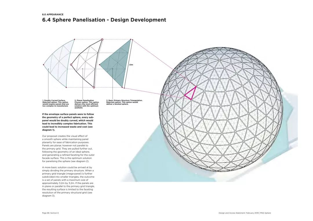 球体的外部覆盖着大约 120 万个圆盘,覆盖面积超过三个足球场,每个圆盘包含 48 个独立的 LED,可以显示 2.56 亿种不同的颜色,当这些灯全部点亮时,创造出大规模的闪烁动态图像,为建筑增添了视觉的魅力。