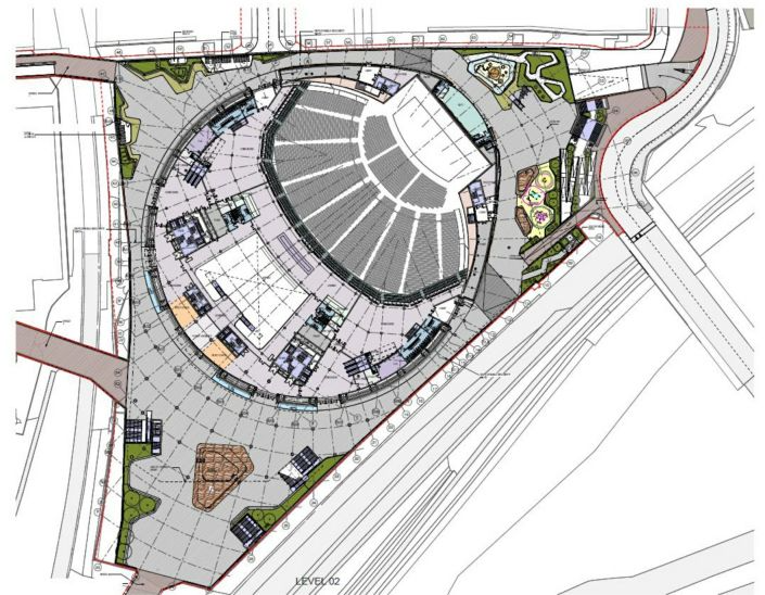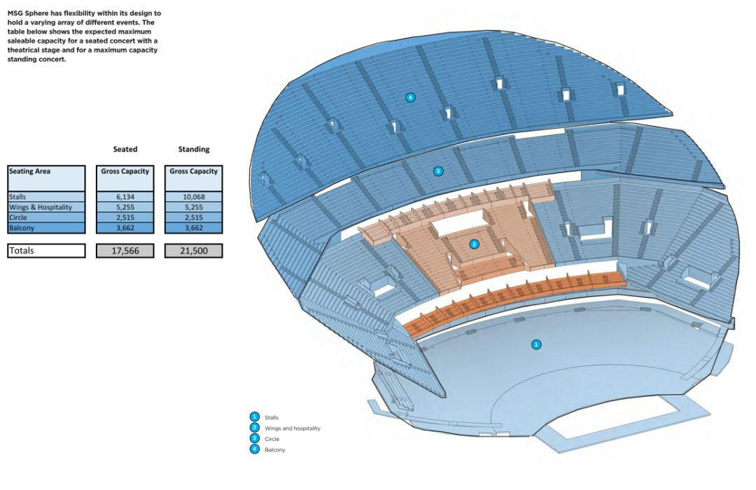 球体内部是一个宽敞的多功能空间,可容纳 20,000 人,包括 17,600 个座位和 2,400 个站立空间。