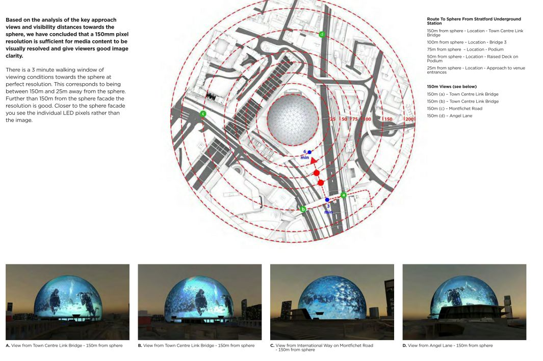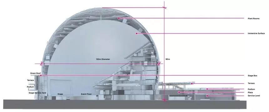 这座球体的 LED 屏幕被命名为 Exosphere,Exosphere 在建筑中将扮演着重要的角色,它的像素可以达到 19,000 x 13,500,观众在 150 米外都可以看到清晰的影像。