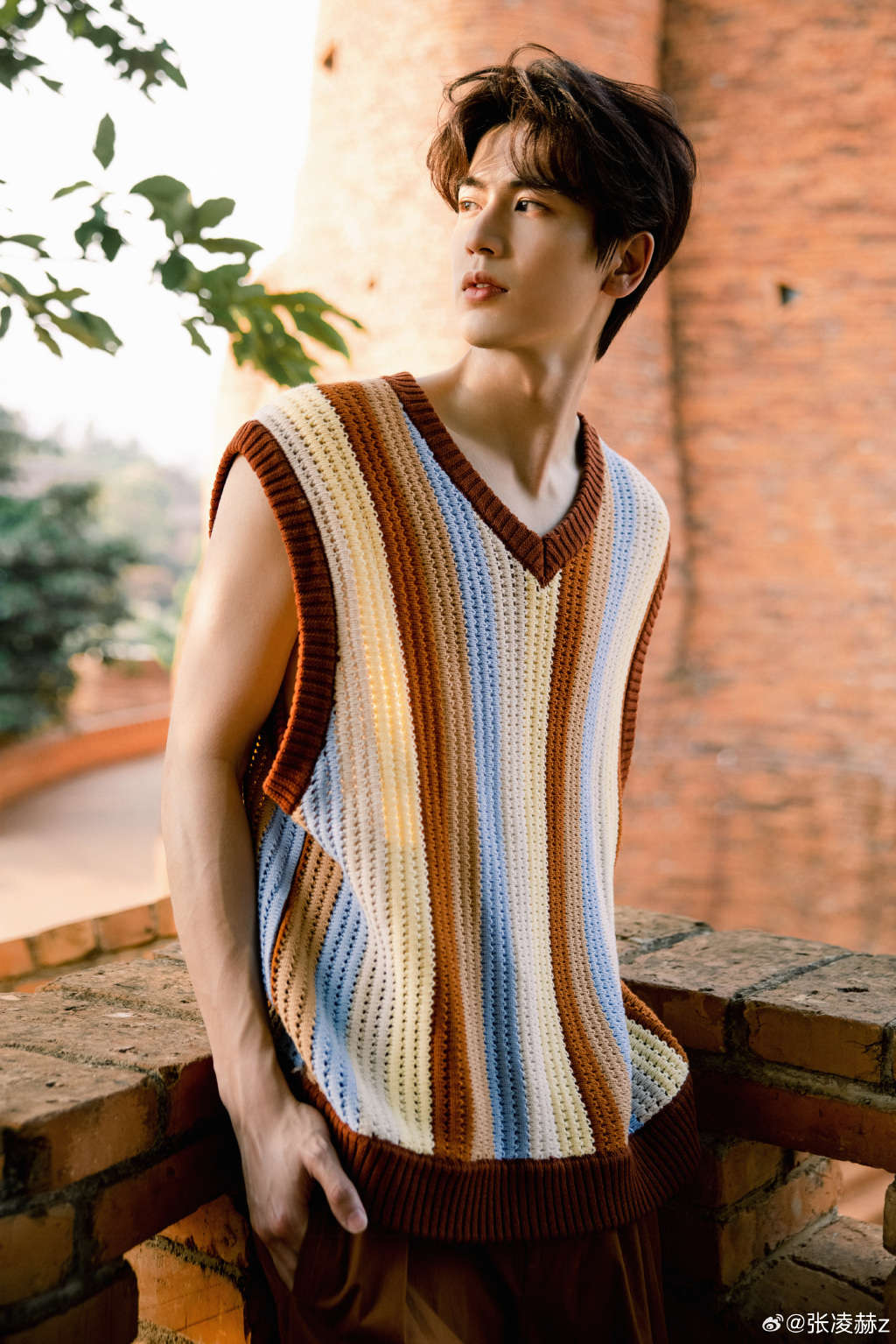 张凌赫三伏天plog释出,拼色无袖针织衫+卷毛造型,清爽帅气。