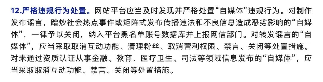 此外,在第12条“严格违规行为处置”中强调了,网站平台应当及时发现并严格处置“自媒体”违规行为。对未通过资质认证从事金融、教育、医疗卫生、司法等领域信息发布的“自媒体”,应当采取取消互动功能、禁言、关闭等处置措施。