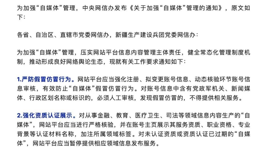《通知》指出,对从事金融、教育、医疗卫生、司法等领域信息内容生产的“自媒体”,网站平台应当进行严格核验,并在账号主页展示其服务资质、职业资格、专业背景等认证材料名称,加注所属领域标签。