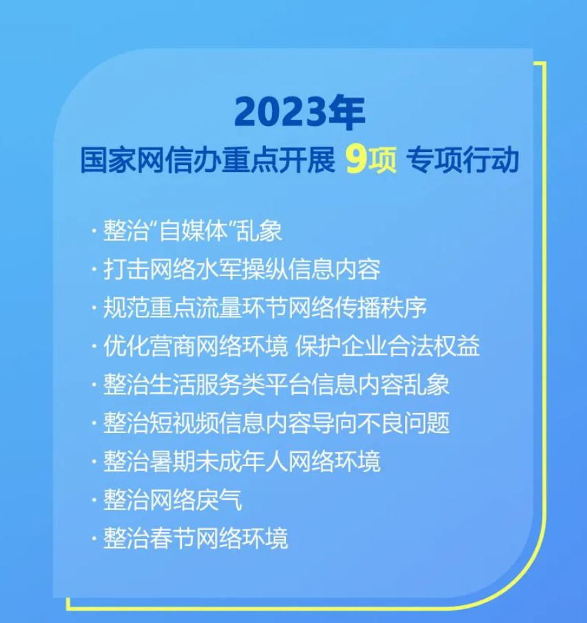 此番我们不妨结合上半年有关自媒体的整治来分析,在3月28日,国务院新闻办公室举行的新闻发布会上,国家互联网信息办公室有关负责人,就已经指出,2023年的专项行动将聚焦自媒体乱象、网络水军操纵信息内容等9方面问题展开整治行动。