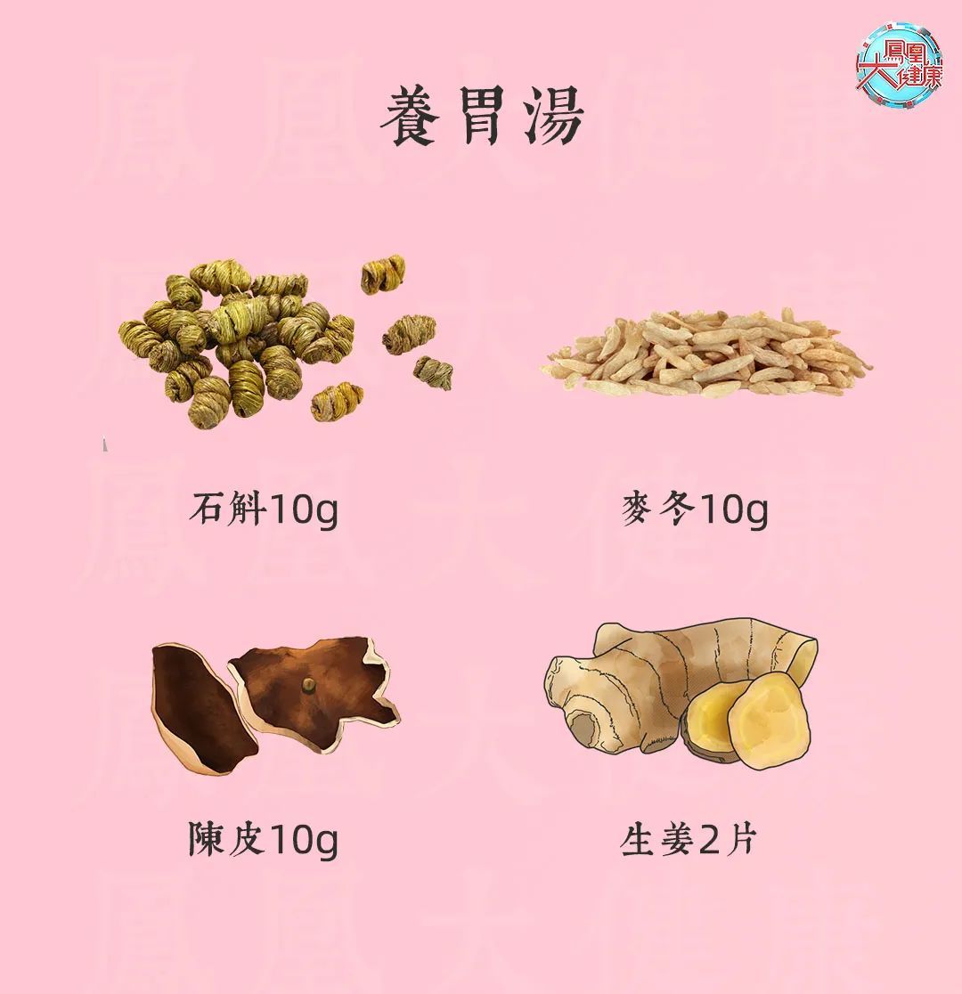 【配方】石斛10g、麦冬10g、陈皮10g、生姜2片
