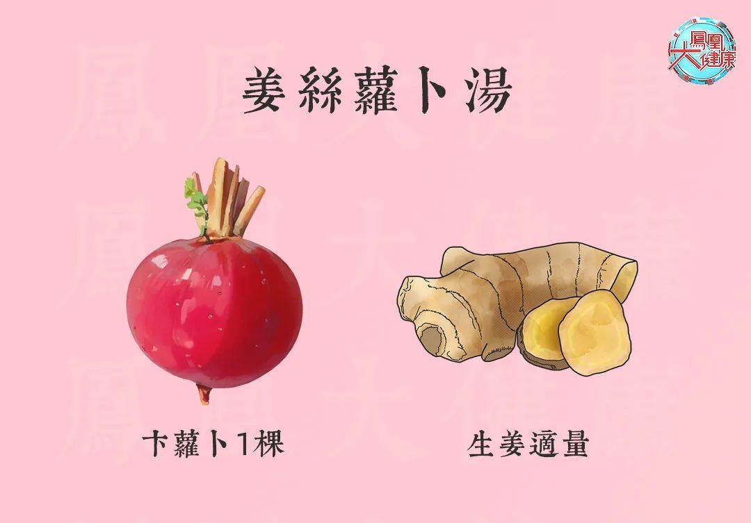 卞萝卜辛甘,有降气、健脾、去湿等功效。萝卜性寒,与偏热的姜可以保持一个良好的平衡,所以姜丝萝卜汤是上好的药食同源汤。