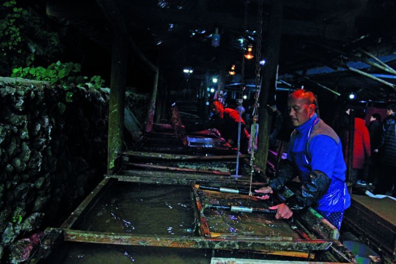 王师傅犹豫了片刻,说:“汪老师,2008 年国家古籍保护中心向我订购纸张时,我送去的纸被退回来两次。说实话,那两批纸都不是在穿洞里做的。”随后,他娓娓道出心里话:“我们自己感觉吧,在穿洞里造纸,最舒服,纸的品质也好,大石壁那里差了点。感觉最不好的,就是在家里做纸。我们也想不明白为什么。反正后来,我是不敢在其他地方做修复用纸,一定都要在穿洞里做。您认识保护中心的老师,所以还请帮我问问,那两次不合格的原因到底是什么。”我满口答应下来,因为我自己也很好奇,一心想知道穿洞的秘密所在。是温度湿度均衡,还是另有原因呢?回去之后我便打电话请教了国家图书馆古籍保护实验室的易晓辉老师,他很快便回复我说,是 pH值不稳定。果然,问题还是出在水质上。看来穿洞内的弱碱性水质确实能保证纸张品质。此外,洞内水温偏低,是否也是更容易造出好纸的原因?