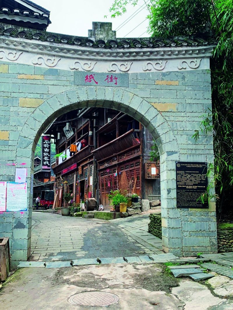 12 月19 日,我从丽江飞抵贵州龙洞堡机场,辗转贵阳火车站,再搭乘 40 多分钟火车到达凯里。当我赶到石桥村时已是午后,王师傅就站在那“纸街”的门楼牌坊下等着我。