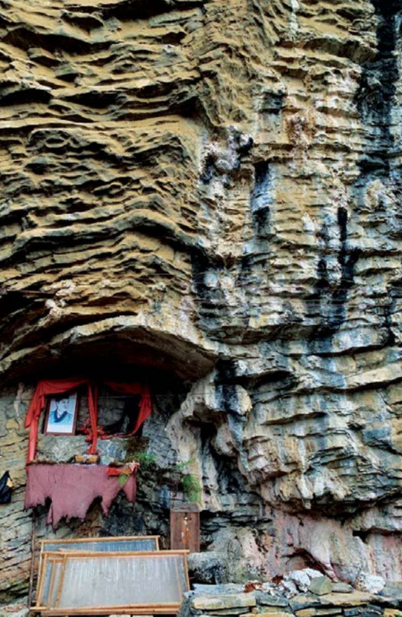 千年石壁上的天然石龛,当地人供奉着蔡伦